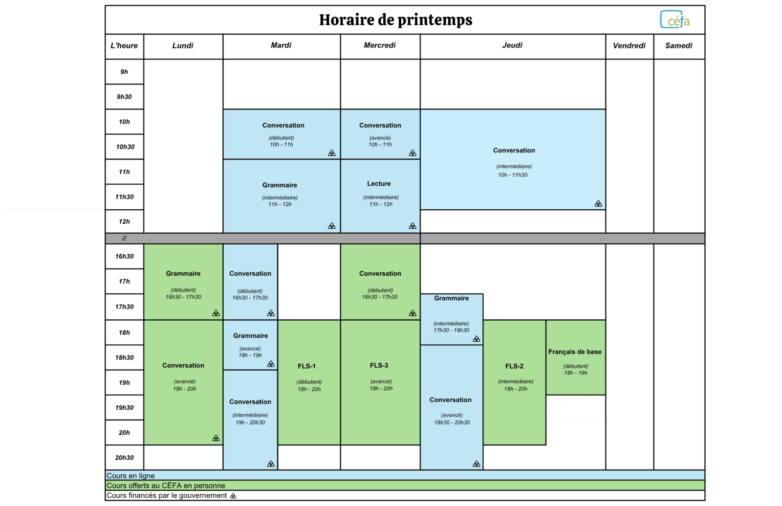 Le CÉFA offre une variété de cours destinés aux francophones et aux personnes bilingues ainsi qu’aux personnes qui désirent apprendre le français. Certains des cours que nous proposons sont gratuits et d’autres ont un coût abordable.