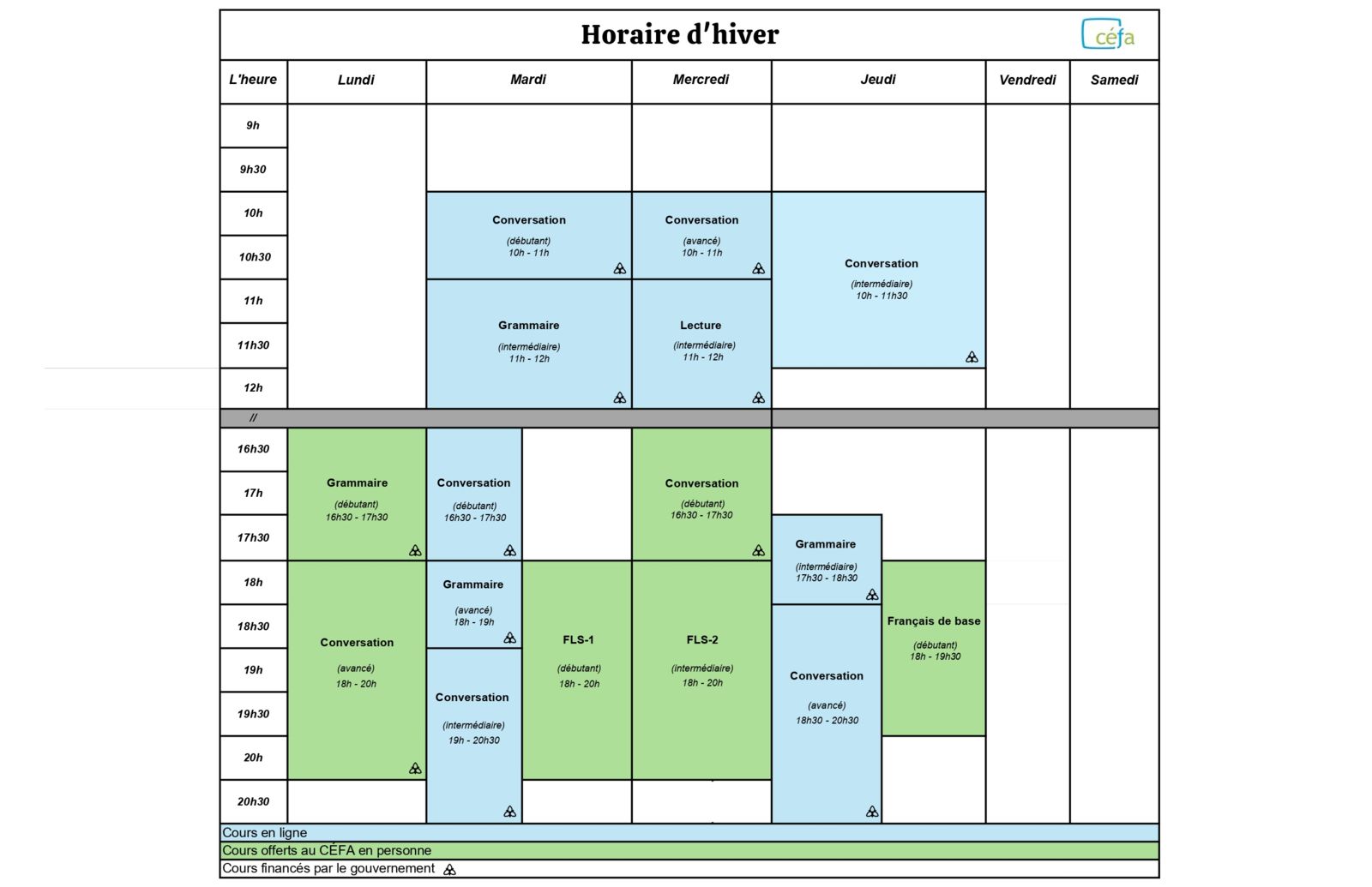 CÉFA offers a variety of courses both designed for Francophones and bilingual people as well as individuals seeking to learn French. Some of the courses we offer are free and others have a cost which will be specified next to each course.